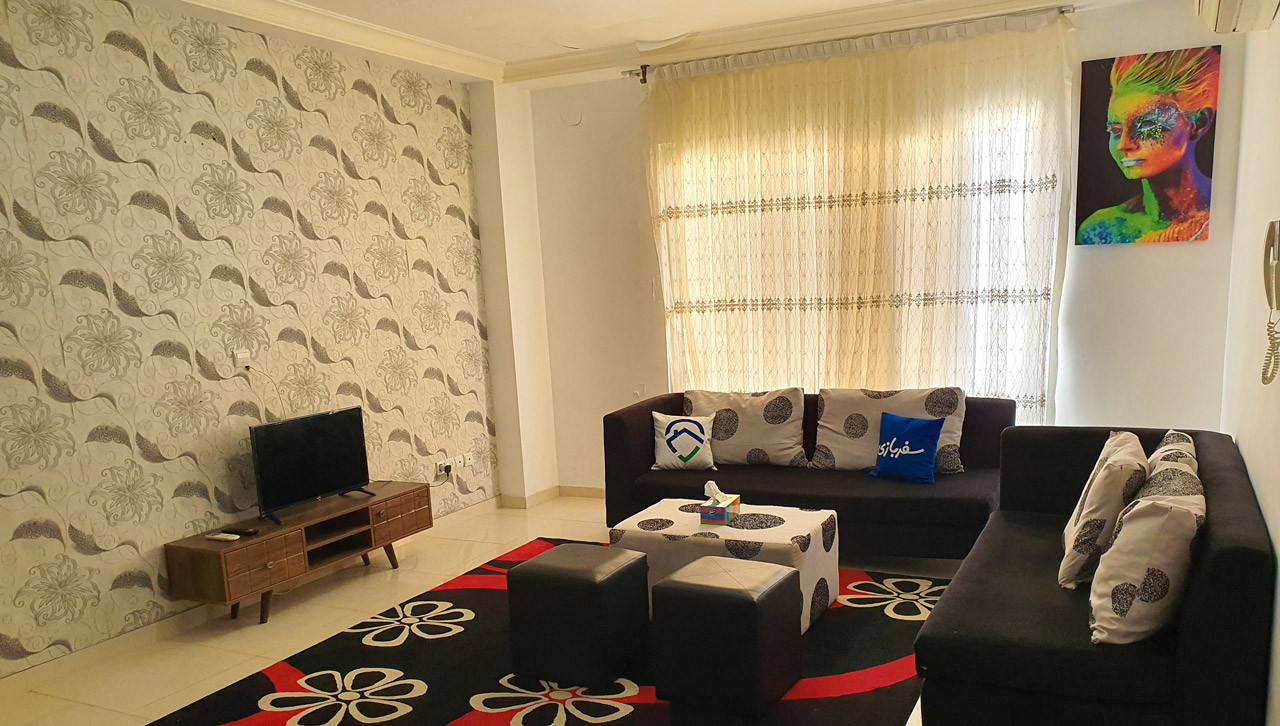 پذیرایی و اتاقهای آپارتمان لوکس یکخوابه در کیش