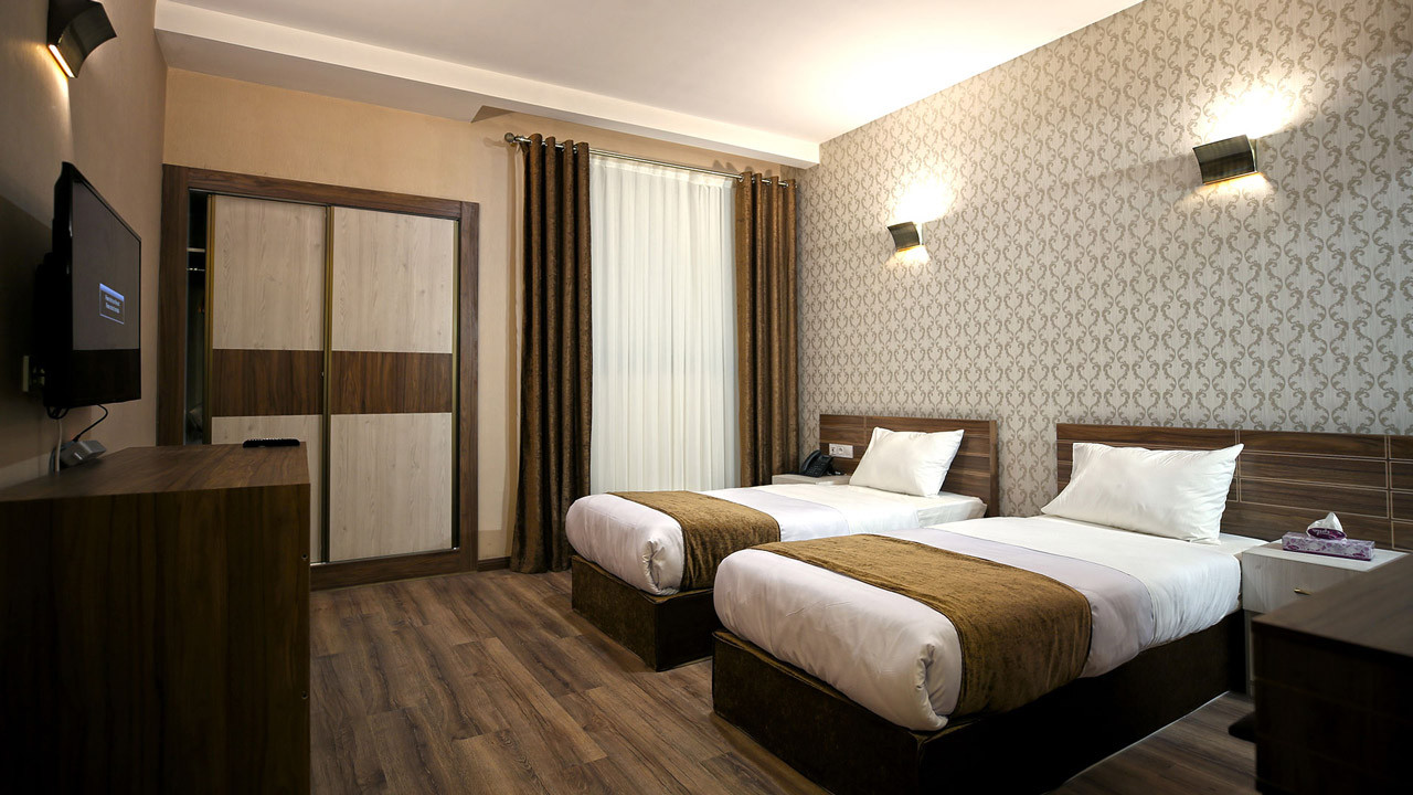 در اتاقهای دو تخته توئین این هتل دو تخت خواب یک نفره با ابعاد استاندارد برای استراحت مسافران قرار داده شده است. اتاقهای لوکس هتل با معماری بسیار چشم نوازی طراحی شده، در این اتاقها از رنگهای روشن و المانهای سنتی همدان استفاده کردهاند.
