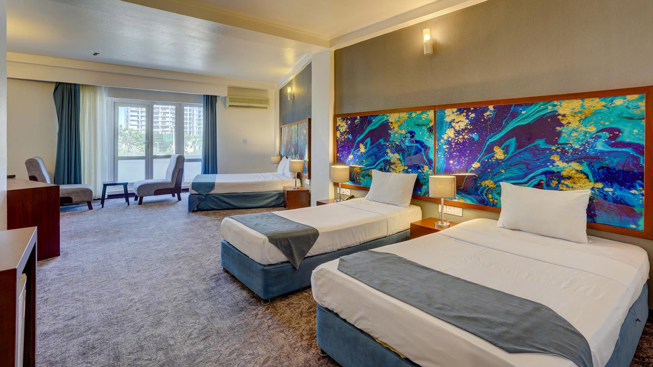 یکی از اتاقهایی که برای خانوادهها و گروههای چهارنفره مناسب است. این اتاق دارای سه تخت خواب بوده و تخت خواب نفر چهارم به صورت تخت تاشو در اختیار مسافران قرار میگیرد. این اتاقها دارای منظره رو به دریا یا رو به محوطه مصفای هتل هستند.