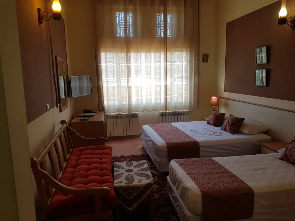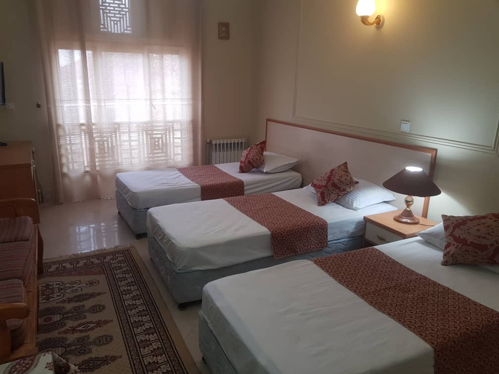 اگر شما با دو نفر از همراهان تان قصد اقامت در ابیانه را دارید، اتاق های سه تخته این هتل سه ستاره برای اقامت شما گزینه مناسبی می باشد. این اتاق ها در طبقات مختلف ساختمان هتل پراکنده است و فضای سنتی اتاق ها با فرش های کاشان لاکی رنگ و روتختی های ترمه نوید یک اقامت جذاب را با امکانات مدرن به مسافران این واحدها می دهد. اینترنت پرسرعت، پک لوازم بهداشتی به تعداد مسافران هر واحد و سرویس صبحانه هم جز خدماتی می باشد که بدون هزینه اضافی در اختیار میهمانان این هتل سه ستاره قرار می گیرد، واحد خانه داری با درخواست میهمانان اتاق های هتل را به صورت روزانه نظافت می کند و وسایل بهداشتی اتاق همچون شامپو، صابون و خمیر دندان نیز شارژ می شود. در این اتاق ها یک تخت دبل و یک تخت تک نفره با ابعاد استاندارد برای استراحت مسافران مهیا شده است و اضافه کردن سرویس برای نفر اضافه در این اتاق امکان پذیر نمی باشد.