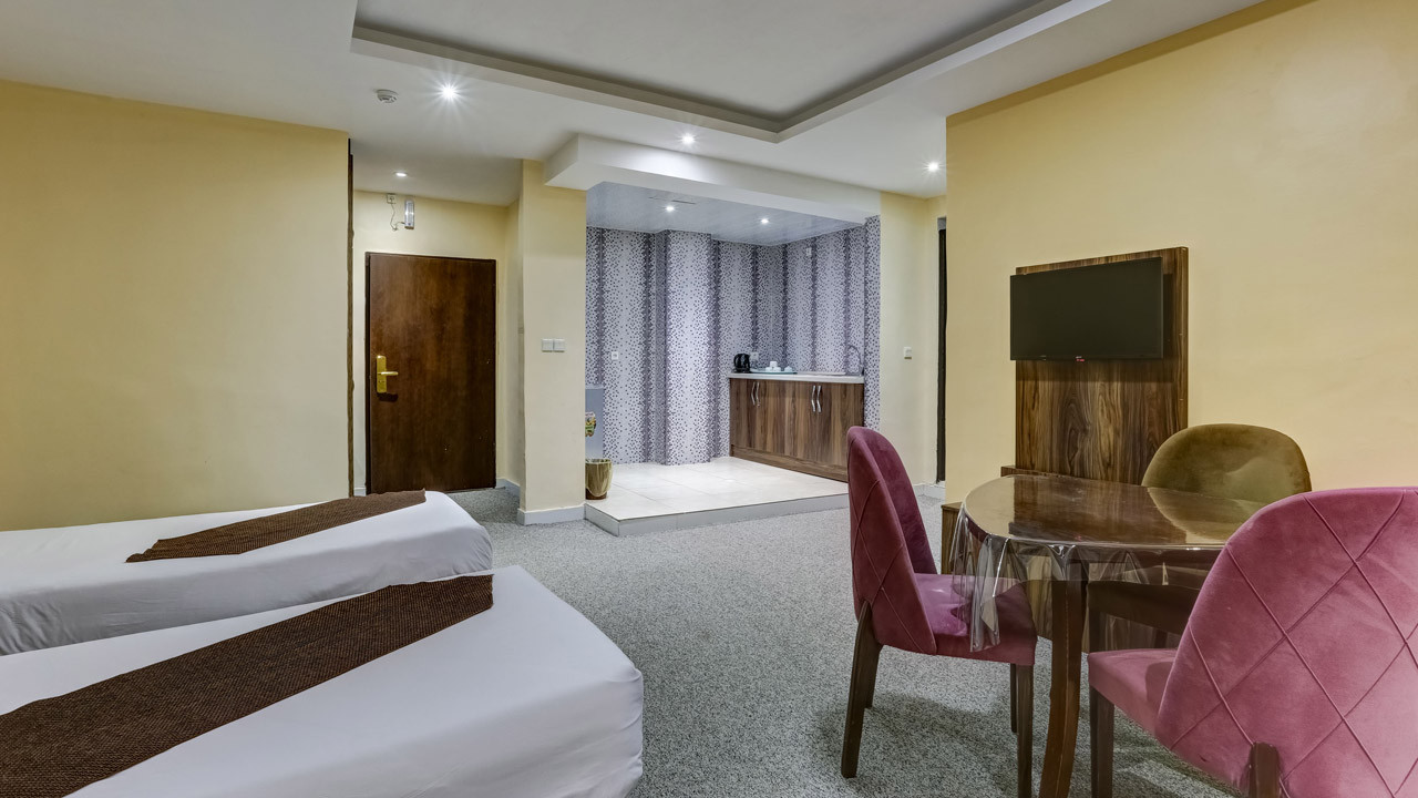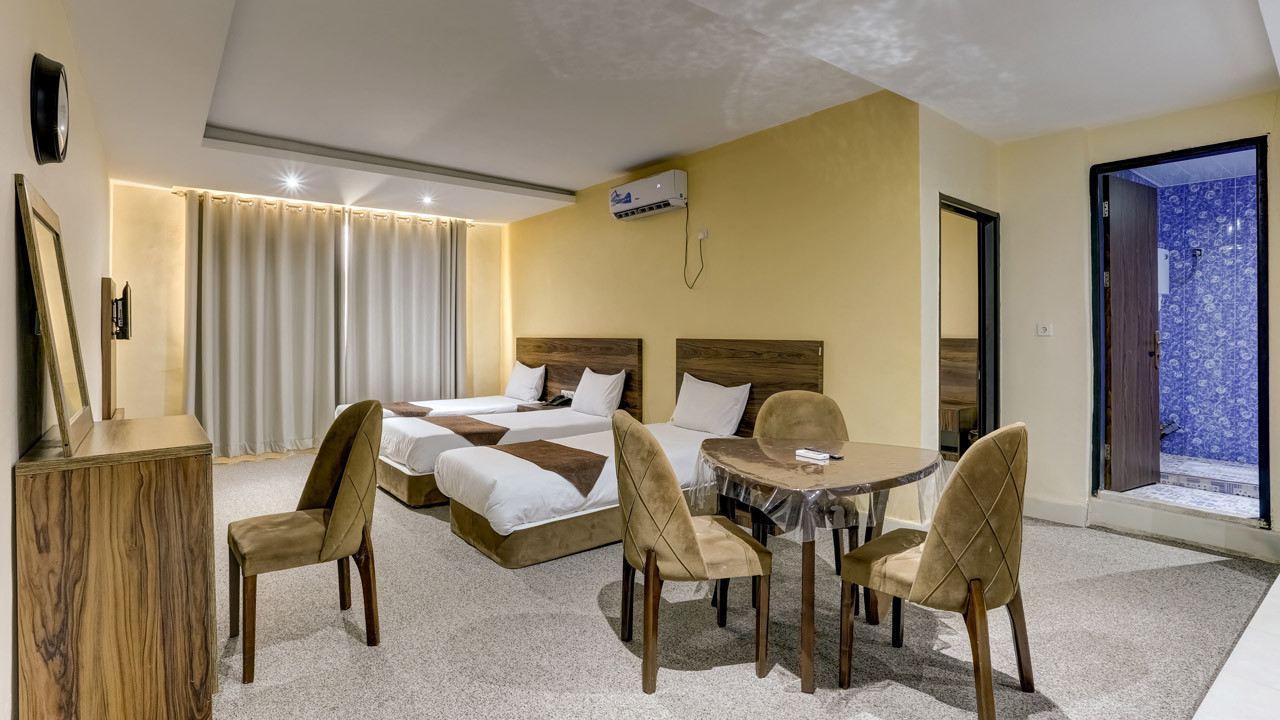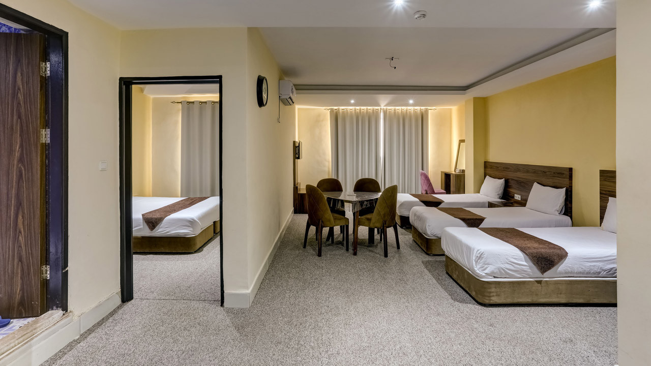 اگر در سفر به قشم جمعی پنج نفره هستید و دوست دارید فضایی آرام و مجهز اقامت کنید، پیشنهاد ما به شما رزرو سوئیت یک خوابه پنج تخته هتل دیاموند قشم است. ویو اتاق های چهار تخته این هتل رو به محوطه زیبای اقامتگاه و زندگی روزمره شهر است. سرویس اضافه این اتاق به صورت کف خواب است. سوئیت پنج تخته هتل دیاموند قشم دارای سه تخت خواب تک نفره و یک تخت دو نفره راحت و تمیز دو است.