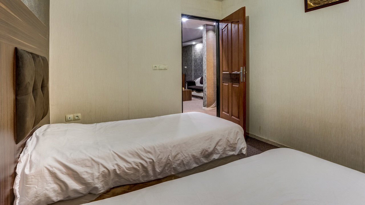 این سوییت دارای دو اتاق مجزا با دو تخت سینگل و یک تخت دبل با مبلمان و قالی چیدمان شده است. دارا بودن دو خواب برای سفر خانواده های پر جمعیت یک مزیت بزرگ است. سرویس بهداشتی ایرانی، سرویس بهداشتی فرنگی، حوله حمام، دمپایی حمام، لوازم بهداشتی، صندوق امانات، سشوار، یخچال، سیستم گرمایشی و سرمایشی اسپلیت، میز آرایش، آینه، روم سرویس، سیستم اطفاء حریق، تلویزیون، تلفن، اینترنت، سیستم تهویه مطبوع، مینی بار با هزینه، دمپایی مخصوص اتاق، مینی بار با هزینه، کمد لباس، رخت آویز و امکان شارژ وسایل الکترونیکی از دیگر امکانات این سوئیت می باشد. همچنین یک سرویس کف خواب برای نفر اضافه تدارک دیده شده است.