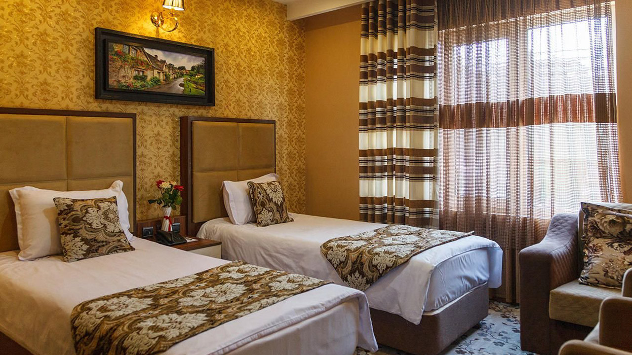 اندازه این اتاق ها هم 22 متر مربع است و ظرفیت یک نفر اضافه را نیز دارد. سرویس خواب این اتاق ها به صورت دو تخت سینگل و سرویس خواب نفر اضافه نیز به صورت تشک است. از امکانات اتاق های دو تخته توئین می توان به صندوق امانات، حمام، سرویس بهداشتی فرنگی، چیلر، جالباسی، تلفن، یخچال، سیستم گرمایشی فن کویل، پنجره دوجداره، میز توالت، مبلمان، مینی بار با هزینه، سیستم اطفاء حریق، تلویزیون، دستگاه چای ساز و... اشاره کرد.