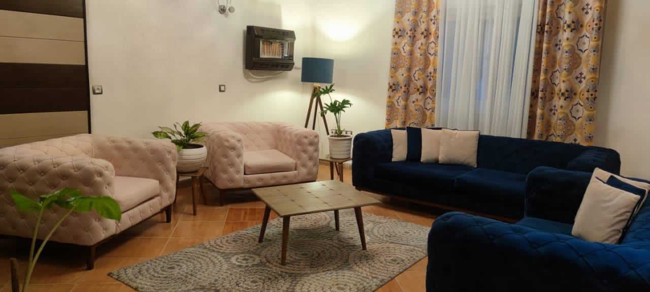 پذیرایی و اتاق‌های ویلا سه خوابه جنگلی محمودآباد